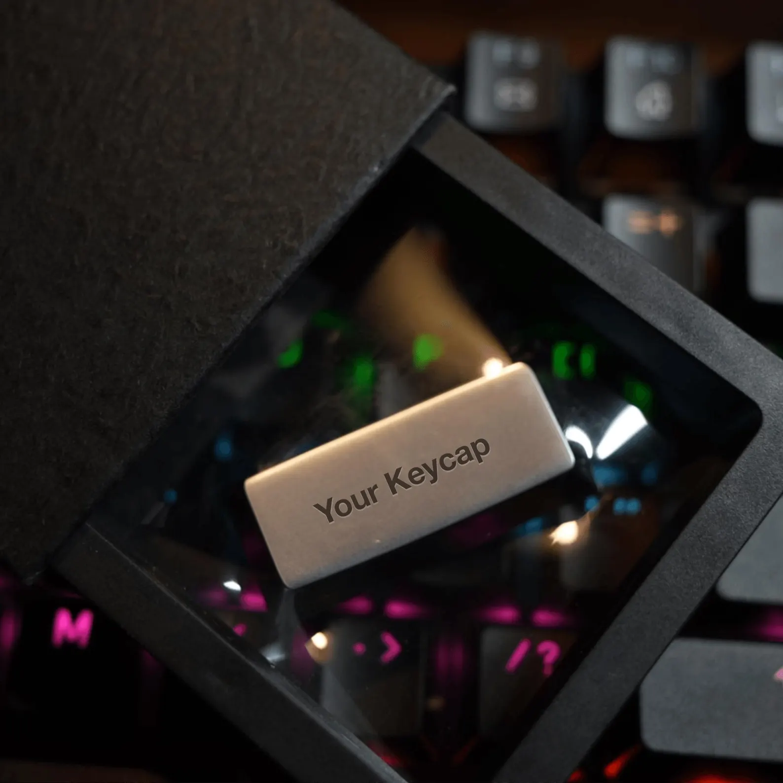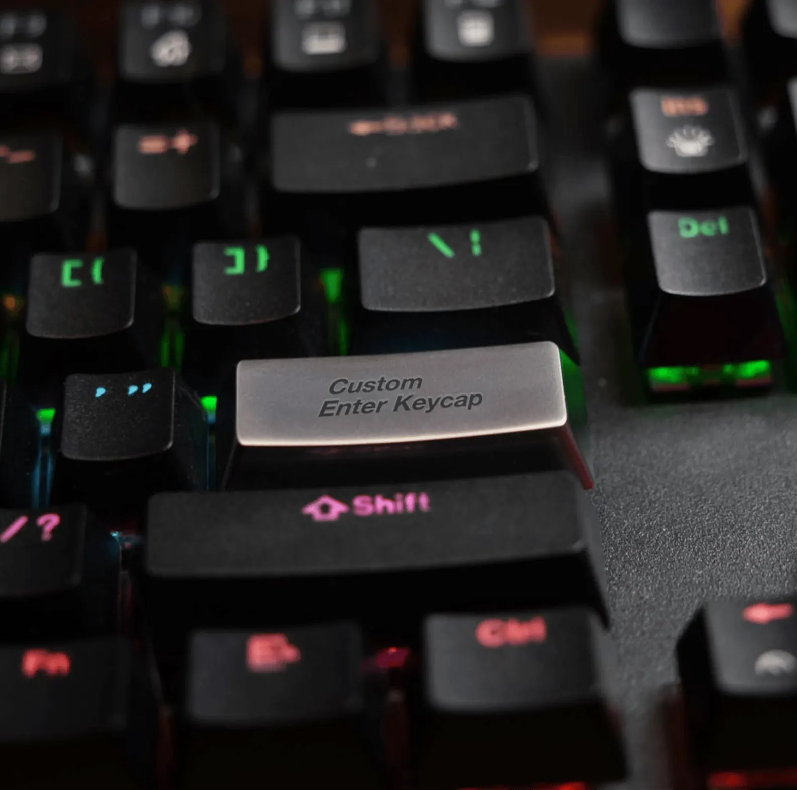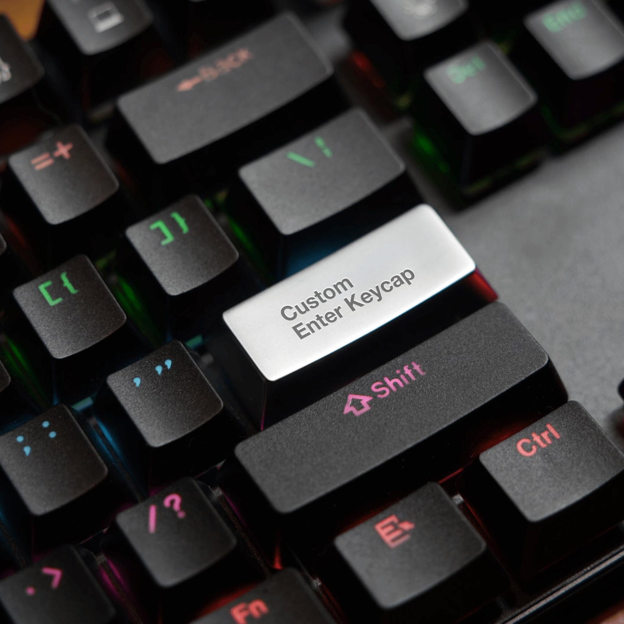 This custom metal keycap for the Enter key is crafted from solid zinc alloy. It is slightly heavier and features a matte, satin finish. We offer laser engraving services to add your personal touch with either text or a custom design.